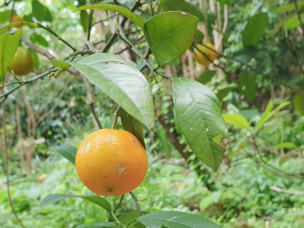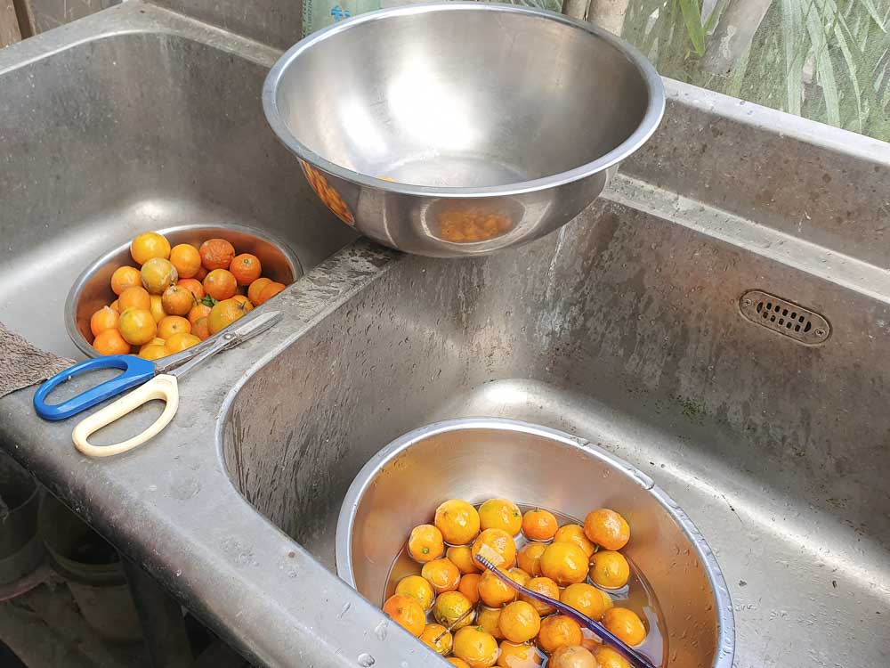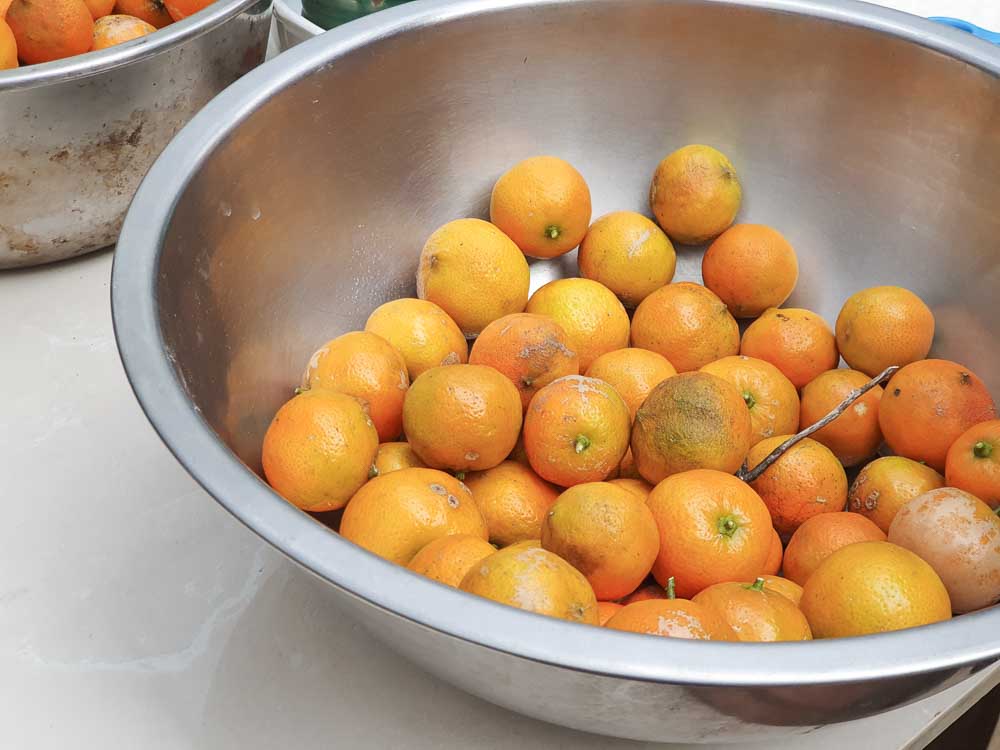 一般製作酸柑茶,大多會使用過年拜拜的「虎頭柑」,它又大顆又酸,很適合拿來製作。這次,因為農場裡,有自然野放生長的「廣東小柑橘」,所以採收它,進行酸柑茶的製作。