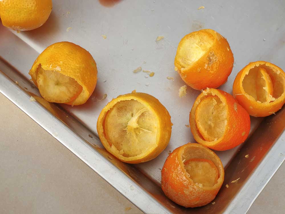 ▲ 挖出橘子果肉,保留外皮。果肉要盡量挖乾淨,但越成熟的果實,皮越薄,容易破,所以力量要拿捏好。