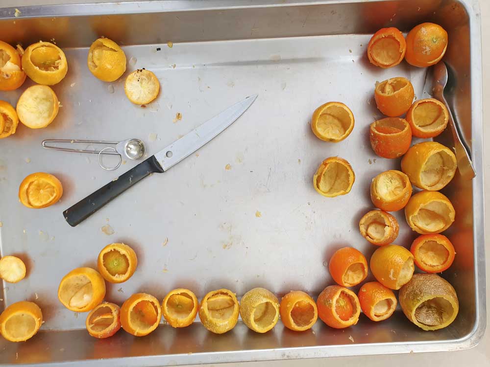 ▲ 蒸完後,找一塊平坦的位置,將柑橘朝上排列整起,拿厚重的木板重壓